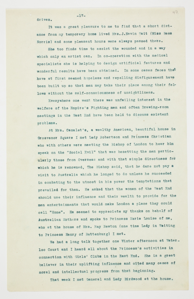 At Mrs. Cazalet's, a wealthy American, beautiful house in Grosvenor Square I met Lady Robertson and Princess Christian who with others were meeting the Bishop of London to hear him speak on the "Social Evil" that was besetting the men particularly those from Overseas and with that simple directness for which he is renowned, The Bishop said, that he dare not pay a visit to Australia which he longed to do unless he succeeded in combating to the utmost in his power the temptations that prevailed for them. He asked that the women of the West End should use their influence and their wealth to provide for the men entertainments that would make London a place they could call "Home". He seemed to appreciate my thanks on behalf of Australian Mothers and spoke to Princess Marie Louise of me, who at the house of Mrs. Hay Newton (one time Lady in Waiting to Princess Henry of Battenburg) I met.