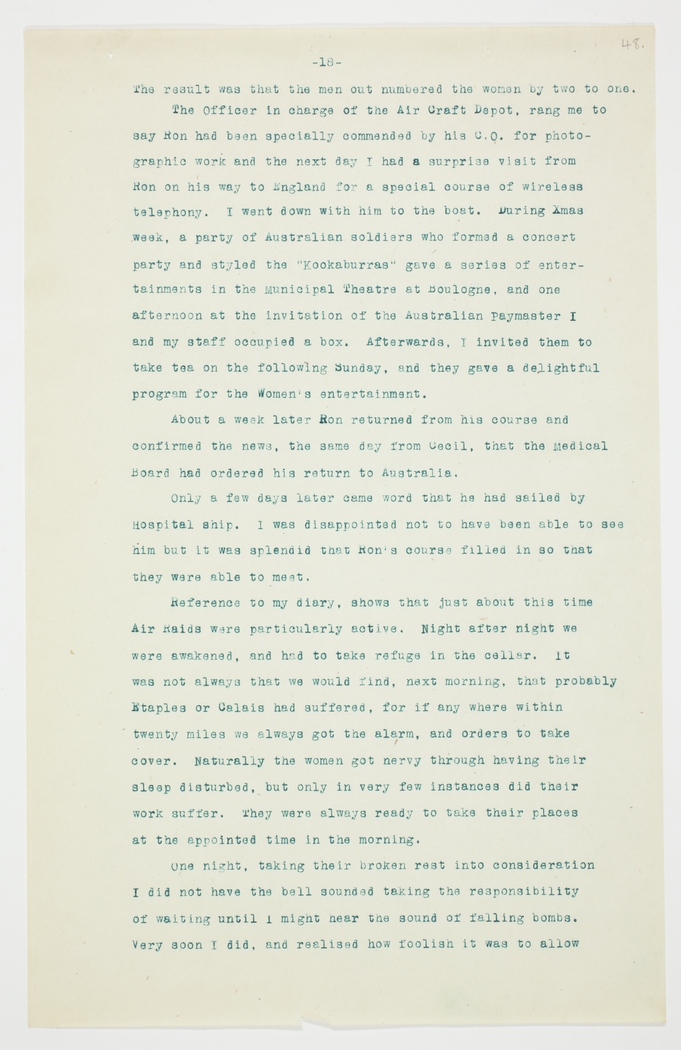 The Officer in charge of the Air Craft Depot, rang me to say Ron had been specially commended by his C.O. for photographic work and the next day I had a surprise visit from Ron on his way to England for a special course of wireless telephony. I went down with him to the boat. During Xmas week, a party of Australian soldiers who formed a concert party and styled the "Kookaburras" gave a series of entertainments in the Municipal Theatre at Boulogne, and one afternoon at the invitation of the Australian Paymaster I and my staff occupied a box. Afterwards, I invited them to take tea on the following Sunday, and they gave a delightful program for the Women's entertainment.