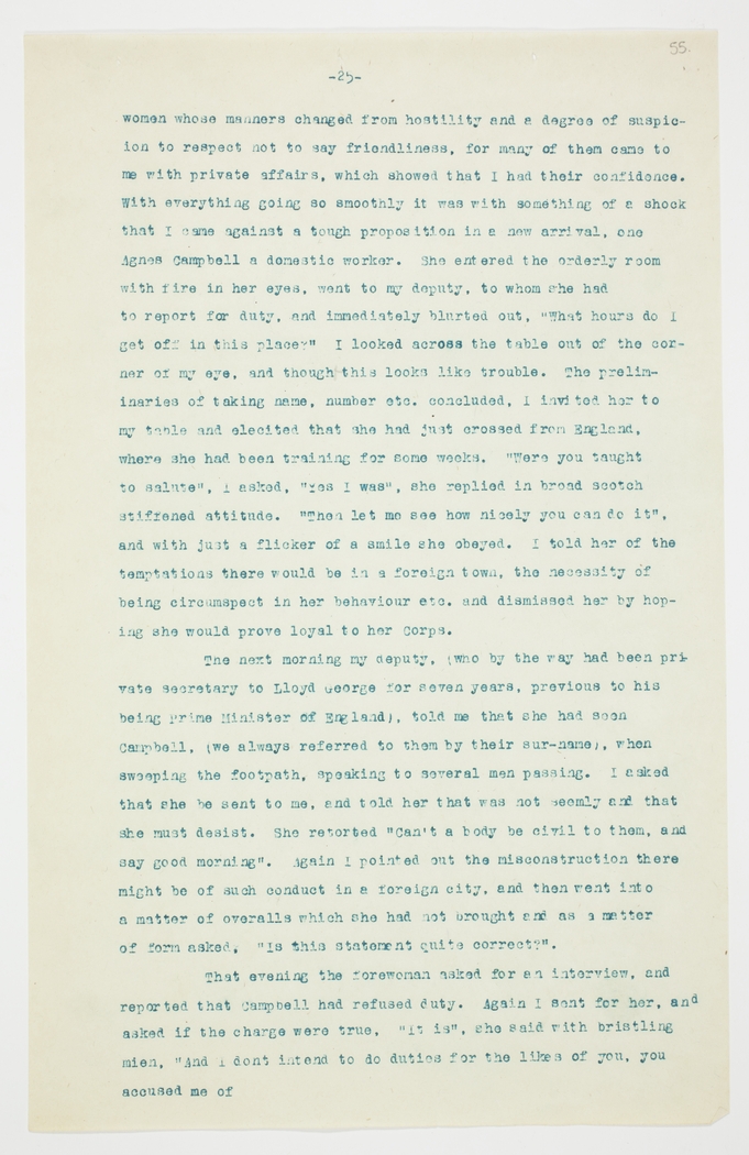 women whose manners changed from hostility and a degree of suspicion to respect not to say friendliness, for many of them came to me with private affairs, which showed that I had their confidence. With everything going so smoothly it was with something of a shock that I came against a tough proposition in a new arrival, one Agnes Campbell a domestic worker. She entered the orderly room with fire in her eyes, went to my deputy, to whom she had to report for duty, and immediately blurted out, "What hours do I get off in this place?" I looked across the table out of the corner of my eye, and though[t] this looks like trouble. The preliminaries of taking name, number etc. concluded, I invited her to my table and elicited that she had just crossed from England, where she had been training for some weeks. "Were you taught to salute", I asked, "Yes I was", she replied in broad scotch stiffened attitude. "Then let me see how nicely you can do it", and with just a flicker of a smile she obeyed. I told her of the temptations there would be in a foreign town, the necessity of being circumspect in her behaviour etc. and dismissed her by hoping she would prove loyal to her Corps.