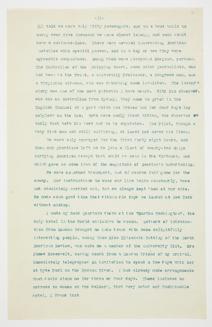 I made my head quarters there at the "Martha Washington", the only hotel in the World exclusive to women. Letters of introduction from London brought me into touch with some delightfully interesting people, among them Miss Elizabeth Cutting of the North American Review, who made me a member of the University Club, Mrs. James Roosevelt, having heard from a London friend of my arrival, immediately telegraphed an invitation to spend a few days with her at Hyde Park on the Hudson River. I had already made arrangements that would claim me for three or four days. These included an address to women at the Waldorf, that very noted and fashionable hotel, I found that