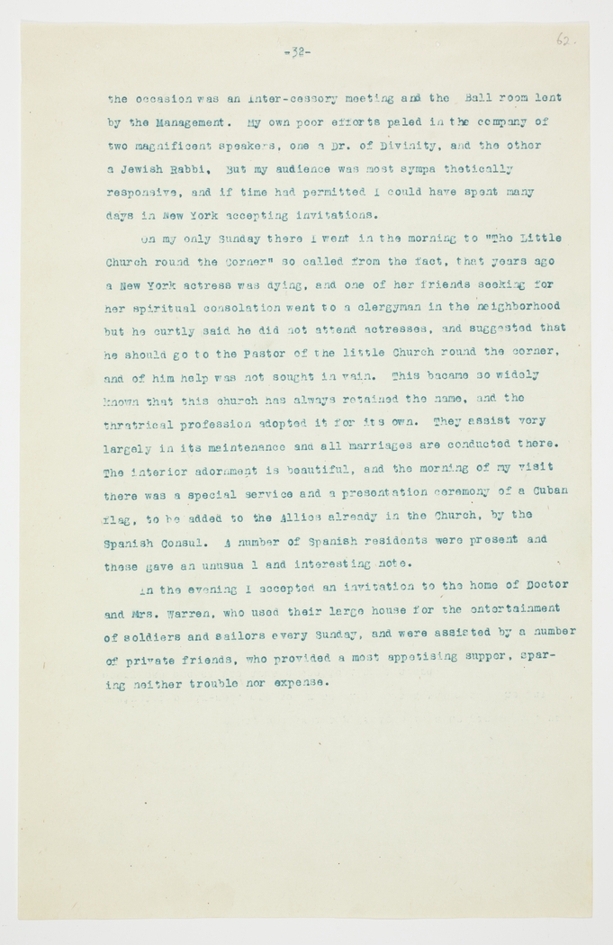 On my only Sunday there I went in the morning to "The Little Church round the Corner" so called from the fact, that years ago a New York actress was dying, and one of her friends seeking for her spiritual consolation went to a clergyman in the neighborhood but he curtly said he did not attend actresses, and suggested that he should go to the Pastor of the little Church round the corner, and of him help was not sought in vain. This became so widely known that this church has always retained the name, and the theatrical profession adopted it for its own. They assist very largely in its maintenance and all marriages are conducted there. The interior adornment is beautiful, and the morning of my visit there was a special service and a presentation ceremony of a Cuban flag, to be added to the Allies already in the Church, by the Spanish Consul. A number of Spanish residents were present and these gave an unusual and interesting note.