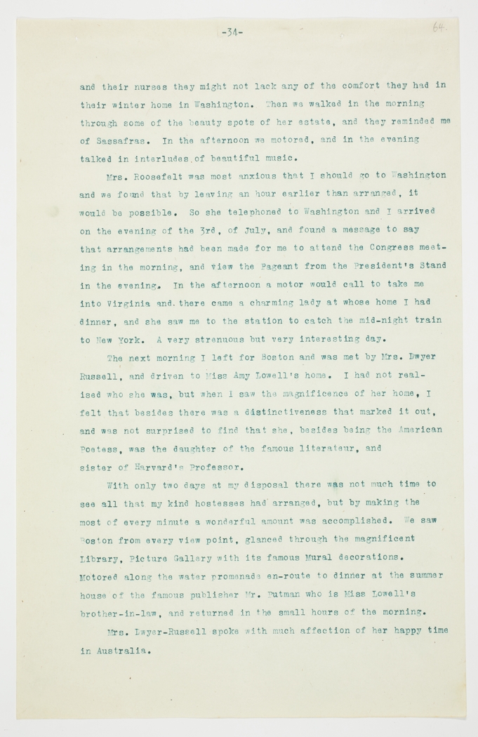 Mrs. Roosevelt was most anxious that I should go to Washington and we found that by leaving an hour earlier than arranged, it would be possible. So she telephoned to Washington and I arrived on the evening of the 3rd of July, and found a message to say that arrangements had been made for me to attend the Congress meeting in the morning, and view the Pageant from the President's Stand in the evening. In the afternoon a motor would call to take me into Virginia and there came a charming lady at whose home I had dinner, and she saw me to the station to catch the mid-night train to New York. A very strenuous but very interesting day.