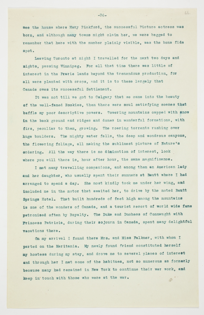 I met many travelling companions, and among them an American lady and her daughter, who usually spent their summers at Bautt [Banff] where I had arranged to spend a day. She most kindly took me under her wing, and included me in the motor that awaited her, to drive by the noted Bautt [Banff] Springs Hotel. That built hundreds of feet high among the mountains is one of the wonders of Canada, and a tourist resort of world wide fame patronised often by Royalty. The Duke and Duchess of Connaught with Princess Patricia, during their sojourn in Canada, spent many delightful vacations there.