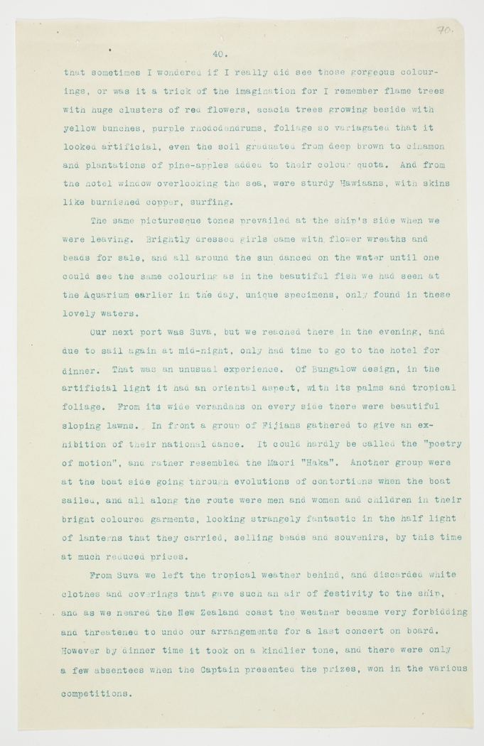 Our next port was Suva, but we reached there in the evening, and due to sail again at mid-night, only had time to go to the hotel for dinner. That was an unusual experience. Of Bungalow design, in the artificial light it had an oriental aspect, with its palms and tropical foliage. From its wide verandahs on every side there were beautiful sloping lawns. In front a group of Fijians gathered to give an exhibition of their national dance. It could hardly be called the "poetry of motion", and rather resembled the Maori "Haka". Another group were at the boat side going through evolutions of contortions when the boat sailed, and all along the route were men and women and children in their bright coloured garments, looking strangely fantastic in the half light of lanterns that they carried, selling beads and souvenirs, by this time at much reduced prices.