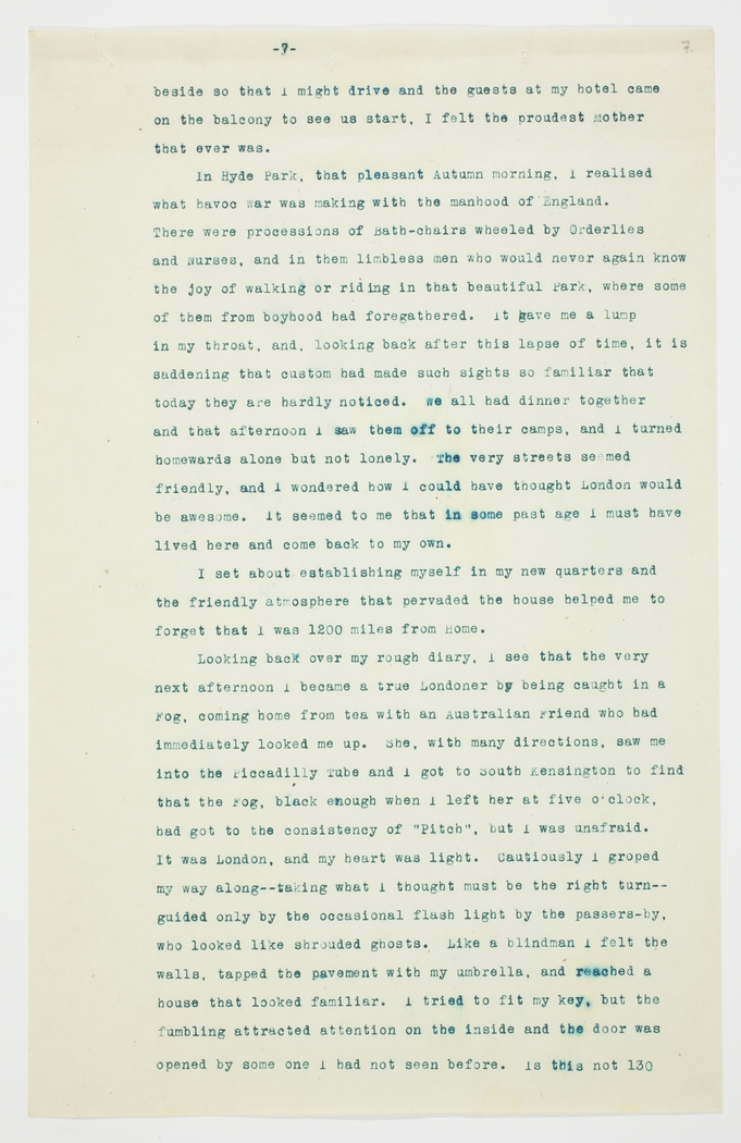 Looking back over my rough diary, I see that the very next afternoon I became a true Londoner by being caught in a Fog, coming home from tea with an Australian Friend who had immediately looked me up. She, with many directions, saw me into the Piccadilly Tube and I got to South Kensington to find that the Fog, black enough when I left her at five o'clock, had got to the consistency of "Pitch", but I was unafraid. It was London, and my heart was light. Cautiously I groped my way along - taking what I thought must be the right turn - guided only by the occasional flash light by the passers-by, who looked like shrouded ghosts. Like a blindman I felt the walls, tapped the pavement with my umbrella, and reached a house that looked familiar. I tried to fit my key, but the fumbling attracted attention on the inside and the door was opened by some one I had not seen before. Is this not 130