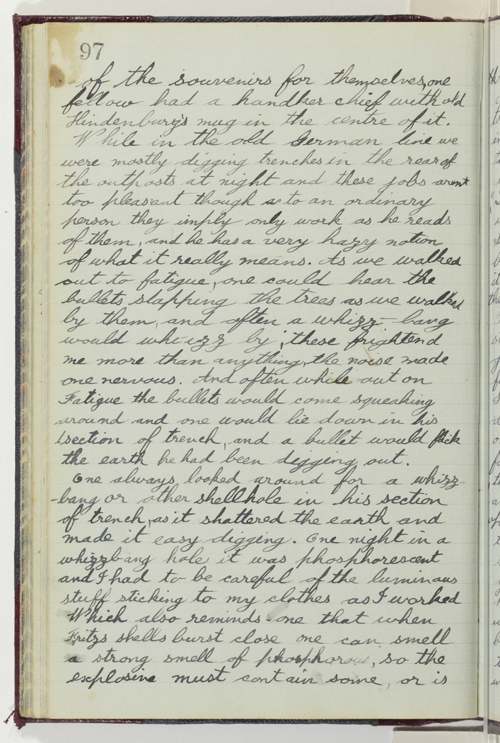 of the souvenirs for themselves, one fellow had a handker chief with old Hindenburg's mug in the centre of it. While in the old German line we were mostly digging trenches in the rear of the outposts at night and these jobs aren't too pleasant though to an ordinary person they imply only work as he reads of them, and he has a very hazy notion of what it really means. As we walked out to fatigue, one could hear the bullets slapping the trees as we walked by them, and often a whiz-bang would whi-izz by; these frightend me more than anything, the noise made one nervous. And often while out on Fatigue the bullets would come squeaking around and one would lie down in his section of trench, and a bullet would flick the earth he had been digging out.