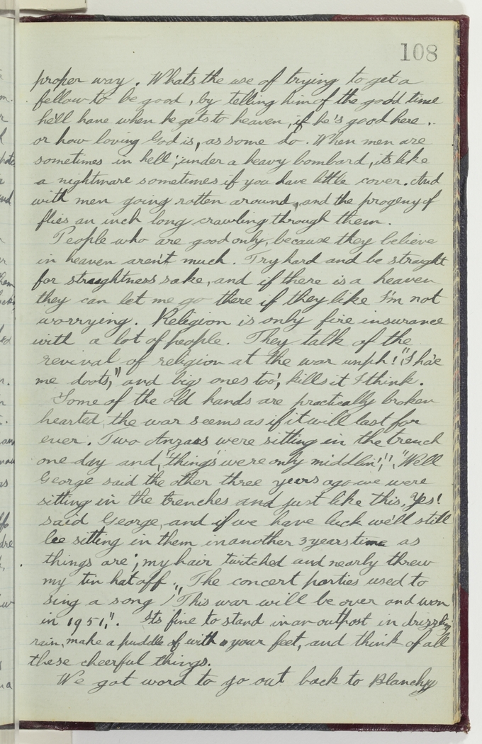 proper way.Whats the use of trying to get a fellow to be good, by telling him of the good time he'll have when he gets to heaven, if he's good here, or how loving God is, as some do? When men are sometimes in hell under a heavy bombard, its like a nightmare sometimes if you have little cover. And with men going rotten around, and the progeny of flies an inch long crawling through them.