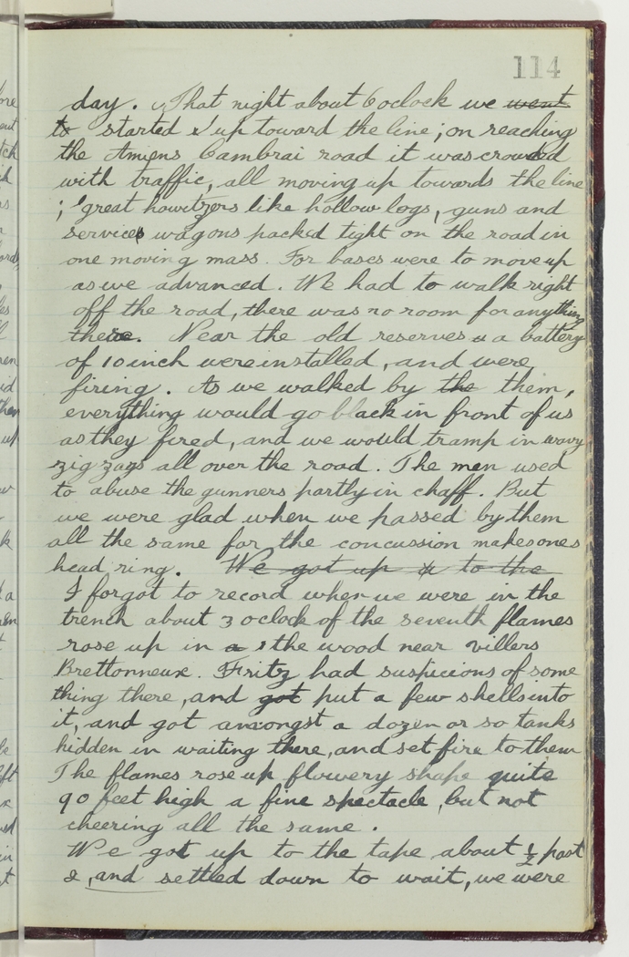 day. That night about 6 o'clock, we started up toward the line; on reaching the Amiens Cambrai road it was crowded with traffic, all moving up towards the line; great howitzers like hollow logs, guns and services wagons packed tight on the road in one moving mass. For bases were to move up as we advanced. We had to walk right off the road, there was no room for anything there. Near the old reserves a battery of 10 inch were installed, and were firing. As we walked by them, everything would go black in front of us as they fired, and we would tramp in wavy zigzags all over the road. The men used to abuse the gunners partly in chaff. But we were glad when we passed by them all the same for the concussion makes ones head ring.