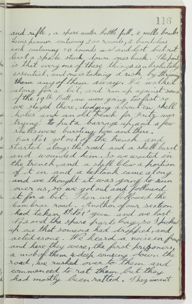 Our No1 got out of the trench and started along the road and a shell burst and wounded him. So we waited in the trench, and a shell blew a portion of it in and a tank came along and we thought it was going to run over us, so we got out and followed it for a bit. Then we followed the Cambrai road. Another of our section had taken No 1s gun and we lost No 2 and the spare parts bag, so I picked up one that someone had dropped, and acted as one. We heard a noise in front and here they were, the first prisoners, a mob of them 4 deep coming down the road, we rushed over to them and commenced to rat them, but they had mostly been ratted. They weren't