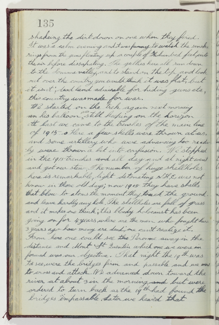 We started on the trek again next morning his balloon was still keeping on the horizon At last we came to the trenches of the main line of 1915. Here a few shells were thrown at us and some artillery who were advancing too readily were thrown a bit into confusion. We stopped in the 1915 trenches all day and at night went and got our stew. The number of huge shellholes here is remarkable, light detonating H,E, was not know in those old days; now 1918 they have shells that blow to atoms the moment they touch the ground and leave hardly any hole. The shellholes are full of grass and it makes one think; this bloody holocaust has been going on for 4 years, where are the men who fought here 3 years ago how many are dead; one can't realize it. From here one could see the Peronne away in the distance and Mont St Quentin which one we were in formed was our objective. That night the 19th was to see, were the bridges firm and passable and we were to cross and attack. We advanced down toward the river at about 3 in the morning, but were ordered to turn back as the 19th had found the bridges impassable. Later we heard that