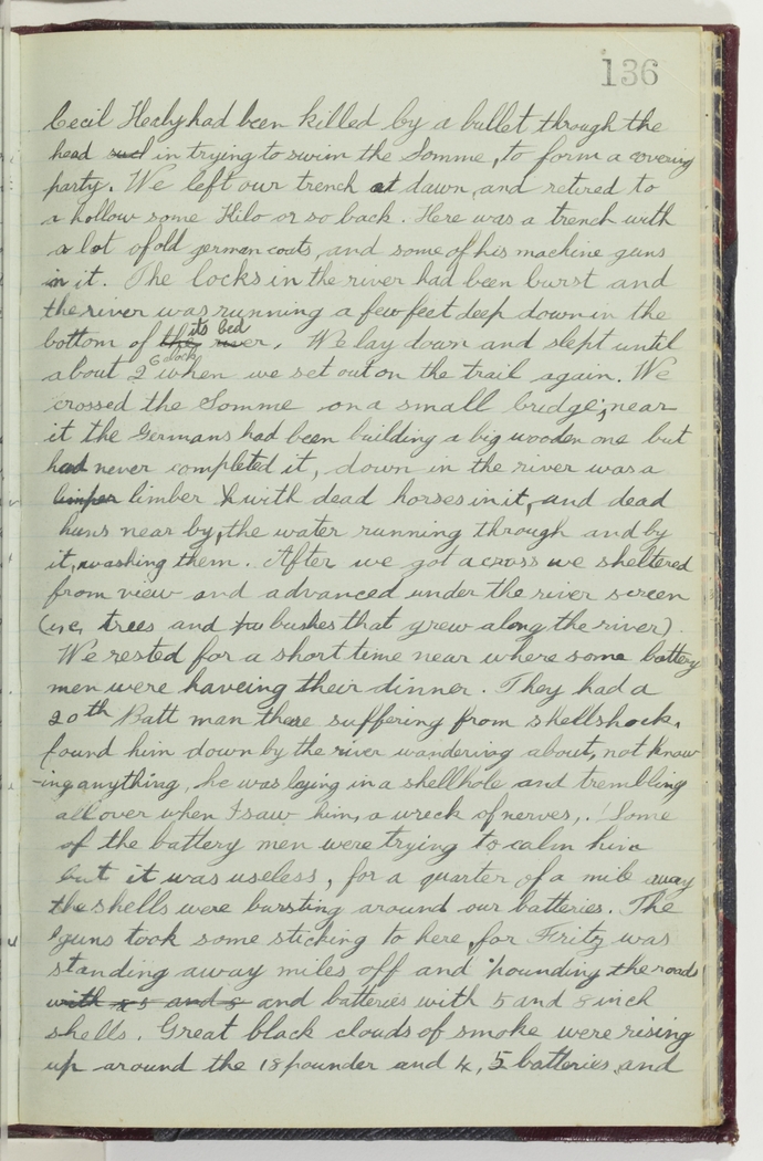 Cecil Healy been killed by a bullet through the head in trying to swim the Somme, to form a covering party. We left our trench at dawn, and retired to a hollow some kilo or so back. Here was a trench with a lot of old german coats, and some of his machine guns in it. The locks in the river had been burst and the river was running a few feet deep down in the bottom of its bed. We lay down and slept until about 2 oclock when we set out on the trail again. We crossed the Somme on a small bridge; near it the Germans had been building a big wooden one but had never completed it, down in the river was a limber with dead horses in it, and dead huns near by, the water running through and by it, washing them. After we got across we sheltered from view and advanced under the river screen (i,e, trees and bushes that grew along the river). We rested for a short time near where some battery men were haveing their dinner. They had a 20th Batt man there suffering from shellshock, found him down by the river wandering about, not knowing anything, he was lying in a shellhole and trembling all over when I saw him, a wreck of nerves. Some of the battery men were trying to calm him but it was useless, for a quarter of a mile away the shells were bursting around our batteries. The guns took some sticking to here, for Fritz was standing away miles off and hounding the roads and batteries with 5 and 8 inch shells. Great black clouds of smoke were rising up around the 18 pounder and 4,5 batteries and