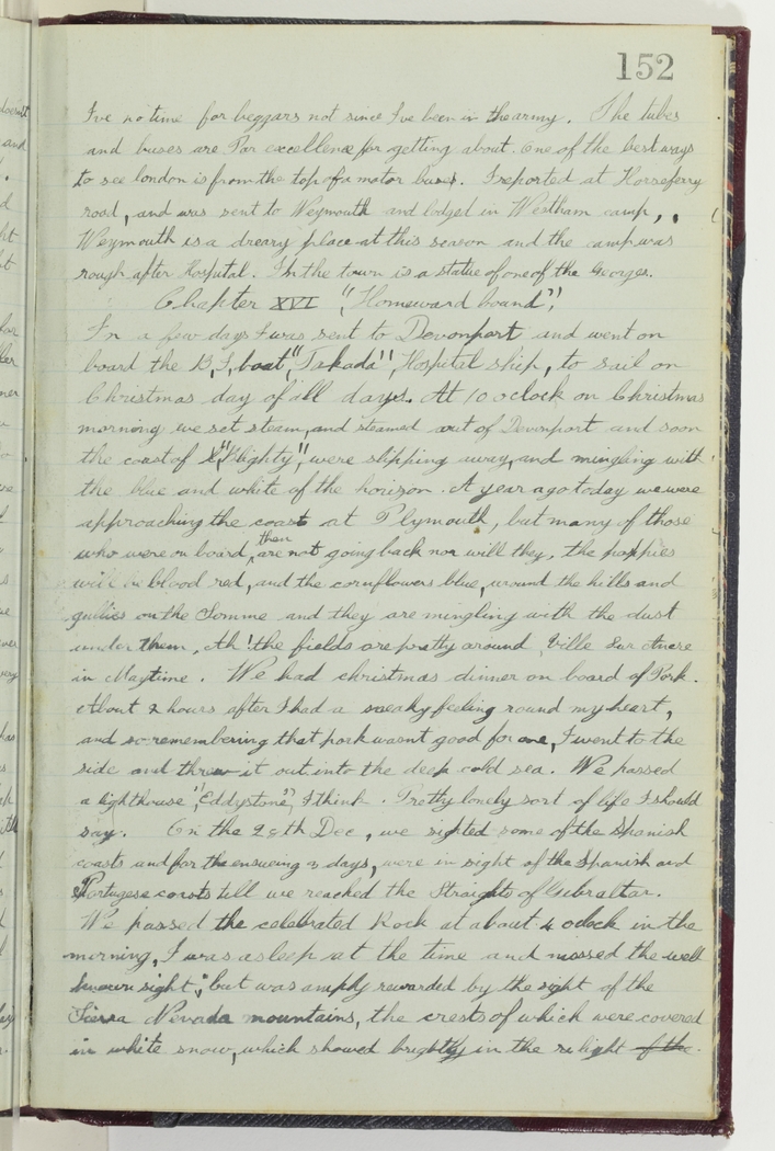 In a few days I was sent to Devonport and went on board the B,I boat "Takada", Hospital ship, to sail on Christmas Day of all days. At 10 oclock on Christmas morning we set steam, and steamed out of Devonport and soon the coast of "Blighty" were slipping away, and mingling with the blue and white of the horizon. A year ago today we were approaching the coast at Plymouth, but many of those who were on board then are not going back nor will they, the poppies will be blood red, and the cornflowers blue, around the hills and gullies on the Somme and they are mingling with the dust under them. Ah! the fields are pretty around, Ville Sur Amere in Maytime. We had christmas dinner on board of Pork. About 2 hours after I had a sneaky feeling round my heart, and so remembering that pork wasnt good for one, I went to the side and threw it out into deep cold sea. We passed a lighthouse "Eddystone" I think. Pretty lonely sort of life I should say. On the 28th Dec, we sighted some of the Spanish coasts and for the ensueing 3 days, were in sight of the Spanish and Portugese coasts till we reached the Straits of Gibraltar. We passed the celebrated Rock at about 4 oclock in the morning. I was asleep at the time and missed the well known sight; but was amply rewarded by the sight of the Sierra Nevada mountains, the crests of which were covered in white snow, which showed brightly in the light.