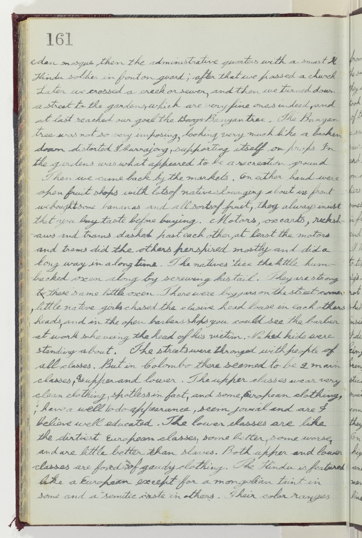 Then we came back by the markets. On either hand were open fruit shops with lots of natives lounging about in front we bought some bananas and all sorts of fruit, they always insist that you taste before buying. Motors, ox carts, rickshaws and trams dashed past each other, at least the motors and trams did the others perspired mostly and did a long way in a long time. The natives 'tice the little humbacked oxen along by screwing his tail. They are strong these same little oxen. There were beggars on the street corner, little native girls chased the elusive head louse in each others heads, and in the open barbers shops you could see the barber at work shaveing the head of his victim. Naked kids were standing about. The streets were thronged with people of all classes. But in Colombo there seemed to be 2 main classes, upper and lower. The upper classes wear very clean clothing, spotless in fact, and some, European clothing; have a well-to-do appearance, seem jovial and are I believe well educated. The lower classes are like the dirtiest European classes, some better, some worse, and are little better than slaves. Both upper and lower classes are fond of gaudy clothing. The Hindu is featured like a European except for a mongolian taint in some and a semetic caste in others. Their color ranges