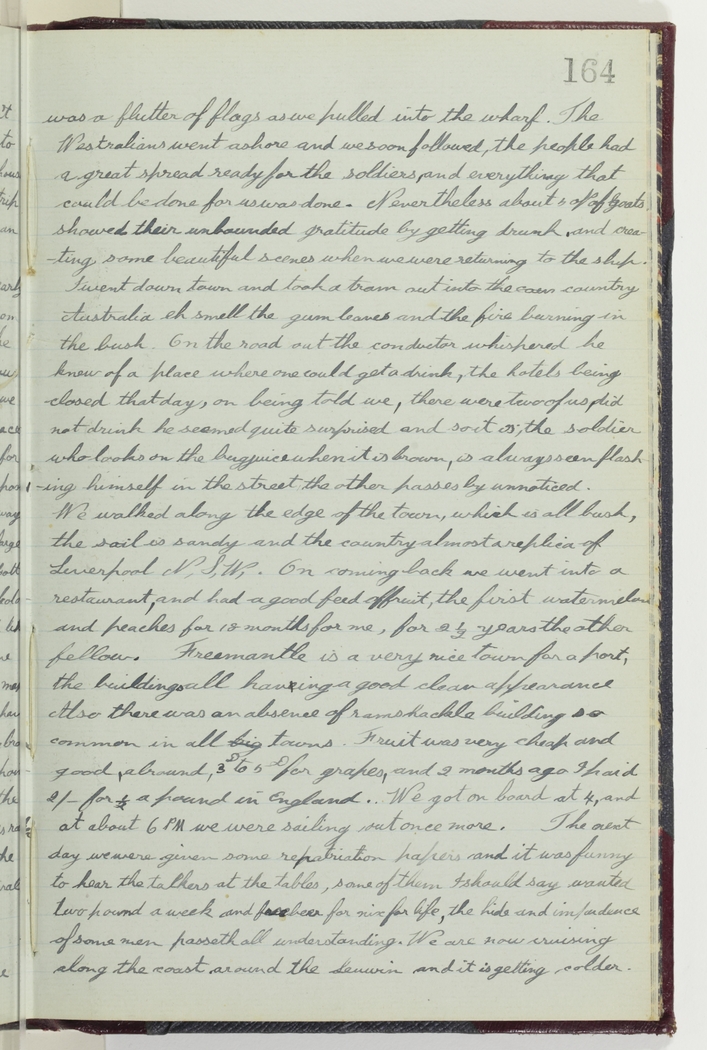 was a flutter of flags as we pulled into the wharf. The Weststralians went ashore and we soon followed, the people had a great spread ready for the soldiers, and everything that could be done for us was done. Nevertheless about 5 % of goats showed their unbounded gratitiude by getting drunk, and creating some beautiful scenes when we were returning to the ship. I went down town and took a tram out into the country. Australia eh smell the gum leaves and the fire burning in the bush. On the road out the conductor whispered he knew of a place where one could get a drink, the hotels being closed that day, on being told we, there were two of us, did not drink he seemed quite surprised and so it is; the soldier who looks on the bugjuice when it is brown, is always seen flashing himself in the street, the other passes by unnoticed.