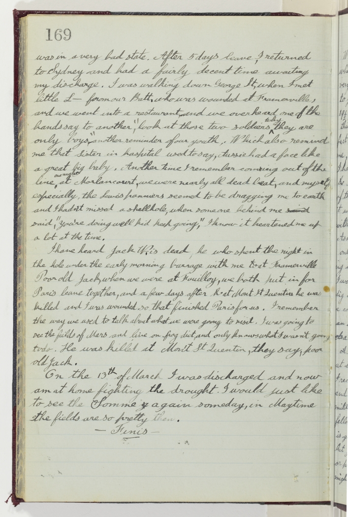 I have heard Jack W-  is dead, he who spent the night in the hole under the early morning barrage with me at Framerville Poor old Jack, when we were at Fouilloy, we both put in for Paris leave together, and a few days after at Mont St Quentin he was killed and I was wounded so that finished Paris for us. I remember the way we used to talk about what we were going to visit. I was going to see the fields of Mars and live on frog diet, and only knows what I wasn't going to do. He was killed at Mon't St Quentin, they say, poor old Jack.