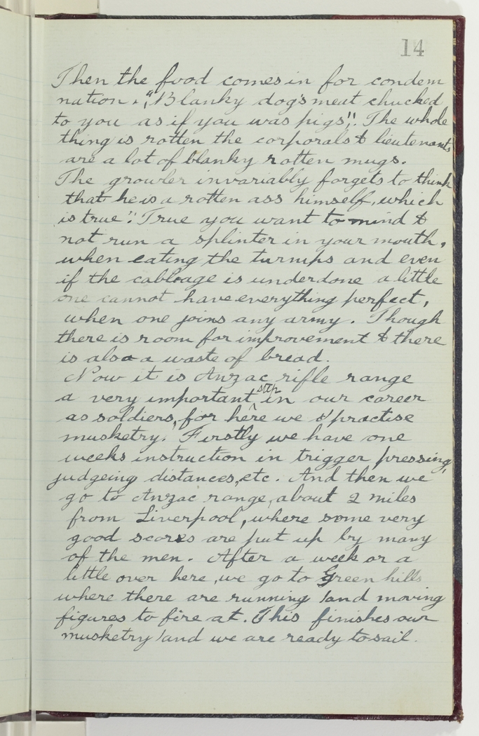 Now it is Anzac rifle range a very important step in our career as soldiers, for here we practise musketry. Firstly we have one weeks instruction in trigger pressing, judgeing distances, etc. And then we go to Anzac range, about 2 miles from Liverpool, where some very good scores are put up by many of the men. After a week or a little over here, we go to Greenhills where there are running land moving figures to fire at. This finishes our musketry and we ready to sail.