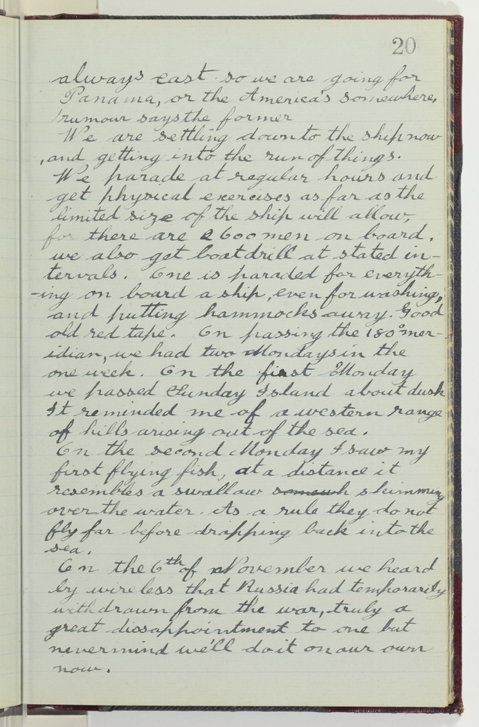 We parade at regular hours and get physical exercises as far as the limited size of the ship will allow, for there are 2,600 men on board, we also get boat drill at stated intervals. One is paraded for everything on board a ship, even for washing, and putting hammocks away. Good old red tape. On passing the 180deg meridien, we had two Mondays in the one week. On the first Monday we passed Sunday Island about dusk. It reminded me of a western range of hills arising out of the sea.