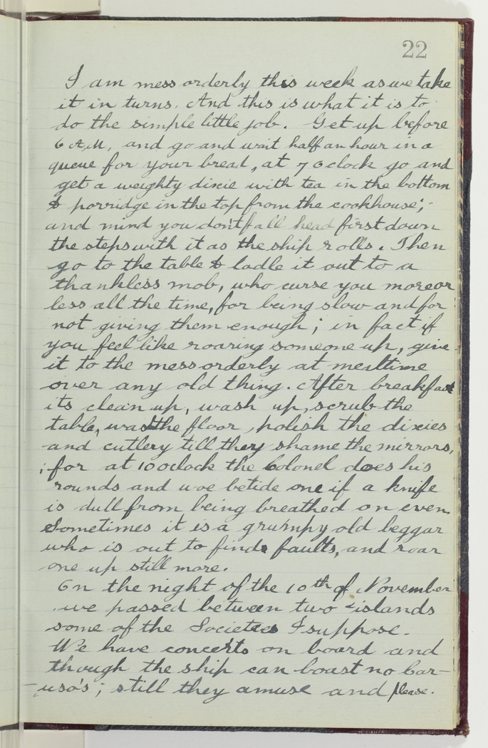 I am mess orderly this week as we take it in turns. And this is what it is to do the simple little job. Get up before 6 A,M, and go and wait half an hour in a queue for your bread, at 7 oclock go and get a weighty dixie with tea in the bottom & porridge in the top from the cookhouse; and mind you don't fall head first down the steps with it as the ship rolls. Then go to the table and ladle it out to a thankless mob, who curse you more or less all the time, for being slow and for not giving them enough; in fact if you feel like roaring someone up, give it to the mess orderly at mealtime over any old thing. After breakfast its clean up, wash up, scrub the table, wash the floor, polish the dixies and cutlery till they shame the mirrors, for at 10 oclock the Colonel does his rounds and woe betide one if a knife is dull from being breathed on even. Sometimes it is a grumpy old beggar who is out to find faults, and roar one up still more.