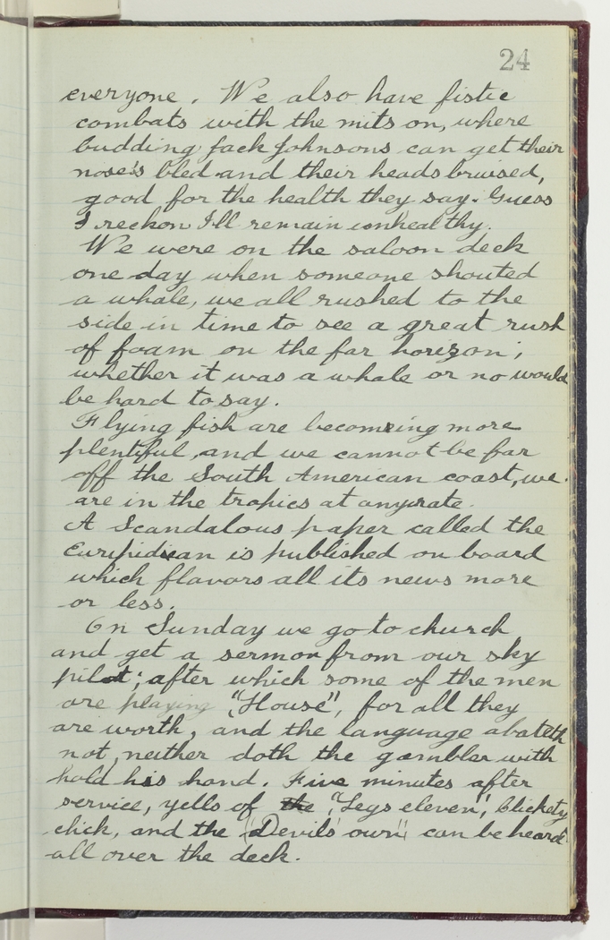 On Sunday we go to church and get a sermon from our sky pilot; after which some of the men are playing "House", for all they are worth, and the language abateth not, neither doth the gambler withhold his hand. Five minutes after service, yells of the ,"Legs eleven", clickety click, and the "Devils' own", can be heard all over the deck.