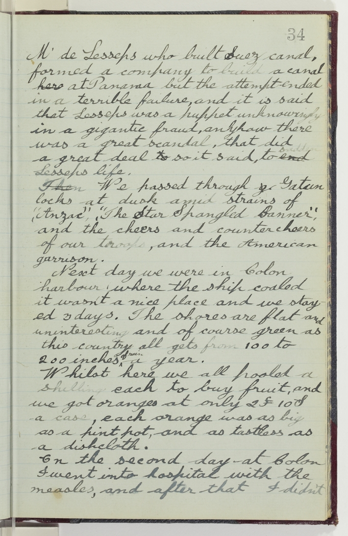 M' de Lesseps who built Suez canal, formed a company to build a canal here at Panama but the attempt ended in a terrible failure, and it is said that Lesseps was a puppet unknowingly in a gigantic fraud, anyhow there was a great scandal, that did a great deal to so it said to end sadden Lesseps life.