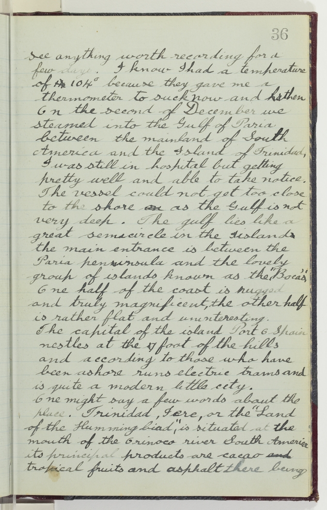see anything worth recording for a few days. I know I had a temperature of 104° because they gave me a thermometer to suck now and then. On the second of December we steamed into the Gulf of Paria between the mainland of South America and the Island of Trinidad. I was still in hospital but getting pretty well and able to take notice. The vessel could not get too close to the shore as the Gulf is not very deep. The Gulf lies like a great semicircle in the islands, the main entrance is between the Paria peninsula and the lovely group of islands known as the "Bocas". One half of the coast is rugged and truly magnificent, the other half is rather flat and uninteresting.