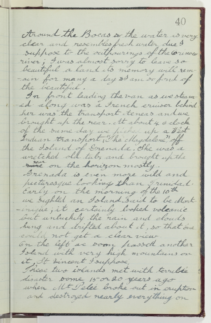 In front leading the van as we steamed along was a French cruiser behind her was the transport Aeneas and we brought up the rear. At about 4 oclock of the same day we picked up a West Indian transport,  "The Magdalene", off the Island of Grenada. She was a wretched old tub, and brought up the rear on the horizon mostly.