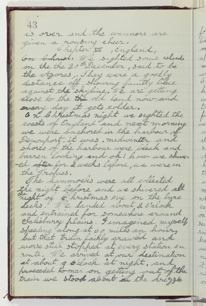 On Christmas night we sighted the coasts of England and next morning we were anchored in the harbour of Devonport, it was midwinter and the shores of the harbour were bleak and barren looking and oh! how we shivered after for 2 weeks before, we were in the Tropics.