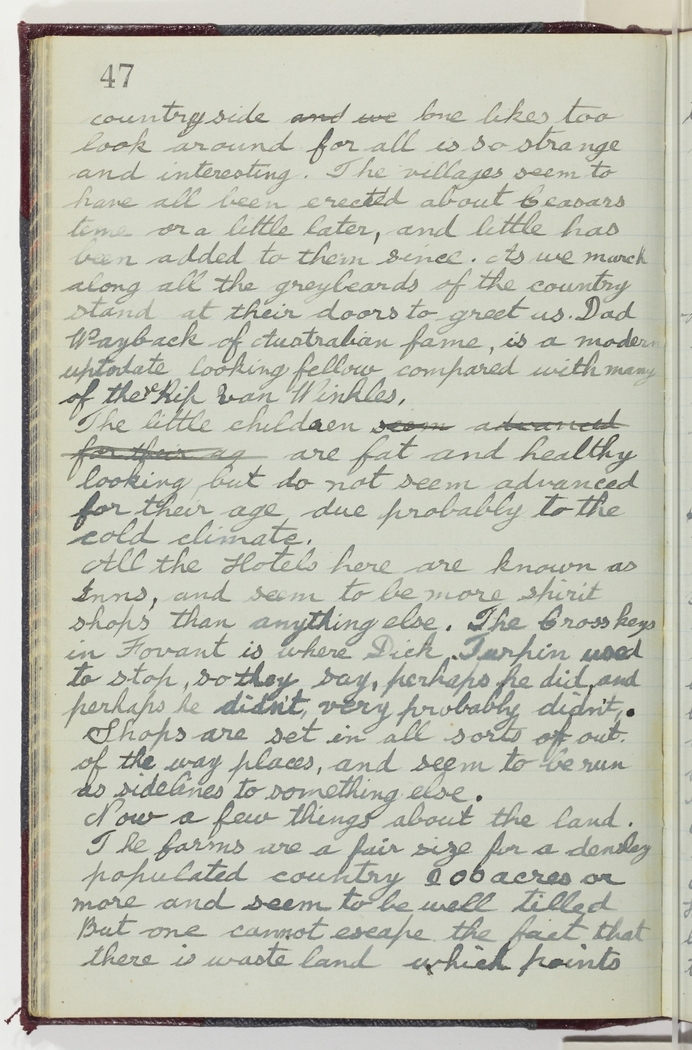 countryside and we one likes too look around for all is so strange and interesting. The villages seem to have all been erected about Ceasars time or a little later, and little has been added to them since. As we march along all the greybeards of the country stand at their doors to greet us. Dad Wayback of Australian fame, is a modern uptodate looking fellow compared with many of the Rip Van Winkles.