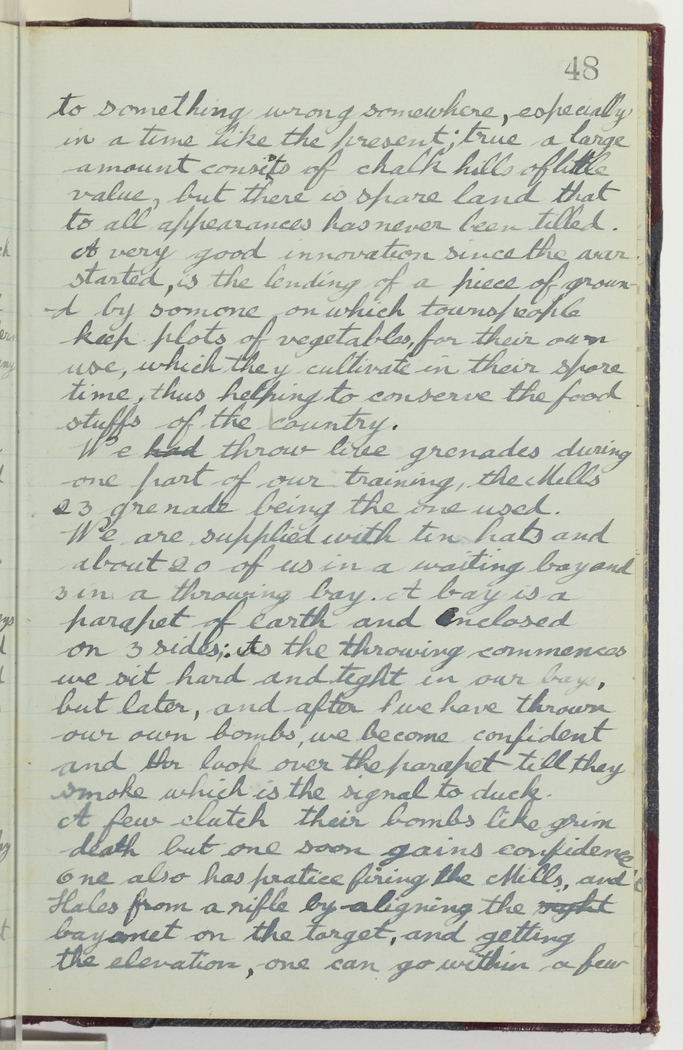 A few clutch their bombs like grim death but one soon gains confidence. One also has practice firing the Mills, and Hales from a rifle by aligning the sight bayonet on the target, and getting the elevation, one can go within a few