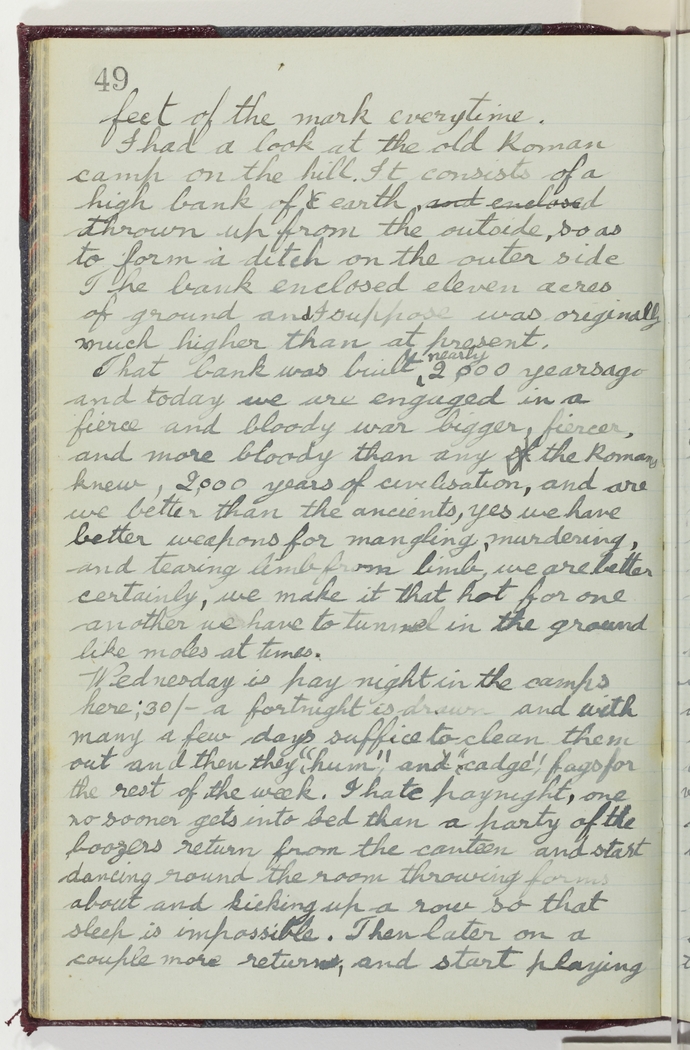 That bank was built nearly 2,000 years ago and today we are engaged in a fierce and bloody war bigger, fiercer, and more bloody than any of of the Romans knew, 2,000 years of civilisation, and are we better than the ancients, yes we have better weapons for mangling, murdering, and tearing limb from limb, we are better certainly, we make it that hot for one another we have to tunnel in the ground like moles at times.