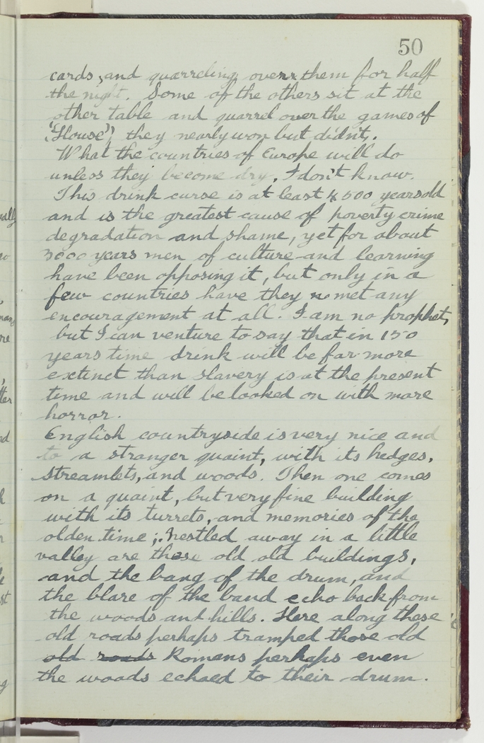English countryside is very nice and to a stranger quaint, with its hedges, streamlets, and woods. Then one comes on a quaint, but very fine building with its turrets, and memories of the olden time; nestled away in a little valley are these old old buildings, and the bang of the drum, and the blare of the band echo back from the woods and hills. Here along these old roads perhaps tramped those old old roads Romans perhaps even the woods echoed to their drum.