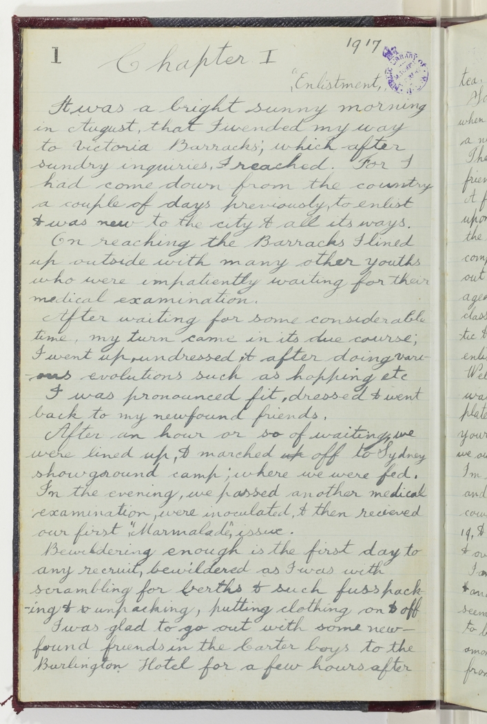 It was a bright sunny morning in August, that I wended my way to Victoria Barracks; which after sundry inquiries, I reached. For I had come down from the country a couple of days previously, to enlist & was new to the city & all its ways.