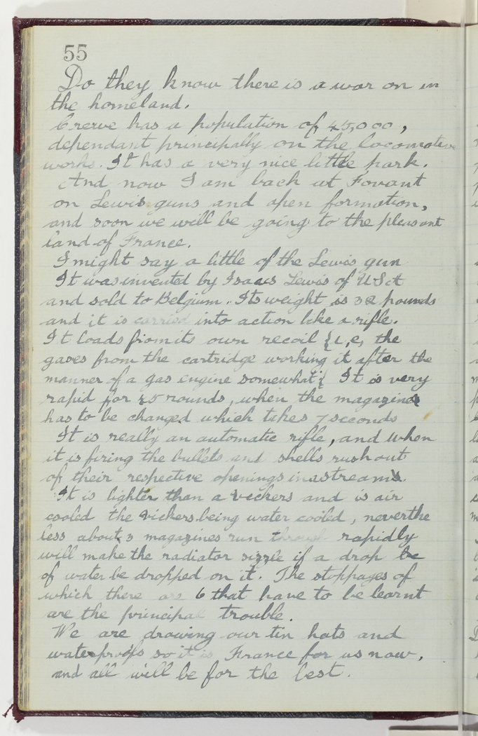 I might say a little of the Lewis gun. It was invented by Isaacs Lewis of USA and sold to Belgium. Its weight is 32 pounds and it is carried into action like a rifle. It loads from its own recoil {i,e, the gases from the cartridge working it after the manner of a gas engine somewhat}. It is very rapid for 45 rounds, when the magazine has to be changed which takes 7 seconds It is really an automatic rifle, and when it is firing the bullets and shells rush out of their respective openings in a stream. It is lighter than Vickers and is air cooled the Vickers being water cooled, nevertheless about 3 magazines run through rapidly will make the radiator sizzle if a drop of water be dropped on it. The stoppages of which there are 6 that have to be learnt are the principal trouble.