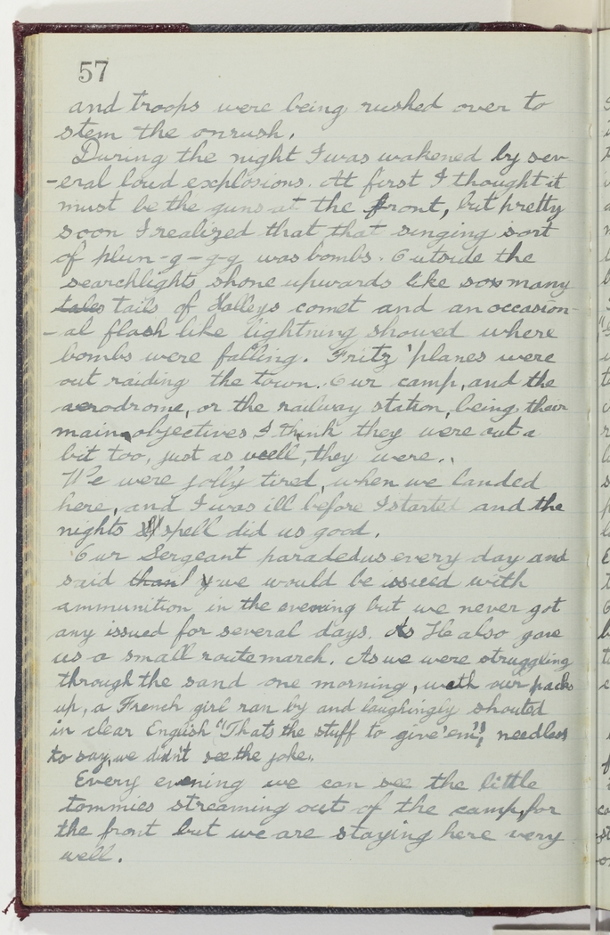 During the night I was wakened by several loud explosions. At first I thought it must be the guns at the front, but pretty soon I realised that that singing sort of plun-g-g-g was bombs. Outside the searchlights shone upwards like so many tales tails of Halleys comet and an occasional flash like lightning showed where bombs were falling. Fritz' planes were out raiding the town. Our camp, and the aerodrome, or the railway station, being their main objectives. I think they were out a bit too, just as well, they were.