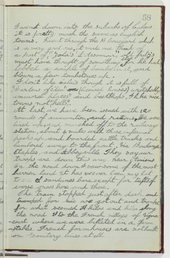 At last, we have been issued with 120 rounds of ammunition, and rations. We were lined up, and marched off to the railway station, about 4 miles with those infernal packs up, and boarded cattle trucks and lumbered away to the front, via Boulonge Etaples, and Abbeyville. They say our troops are down this way near Amiens. On the road down I saw some of the most barren land it has ever been my lot to see sandunes bare except for tufts of coarse grass here and there.