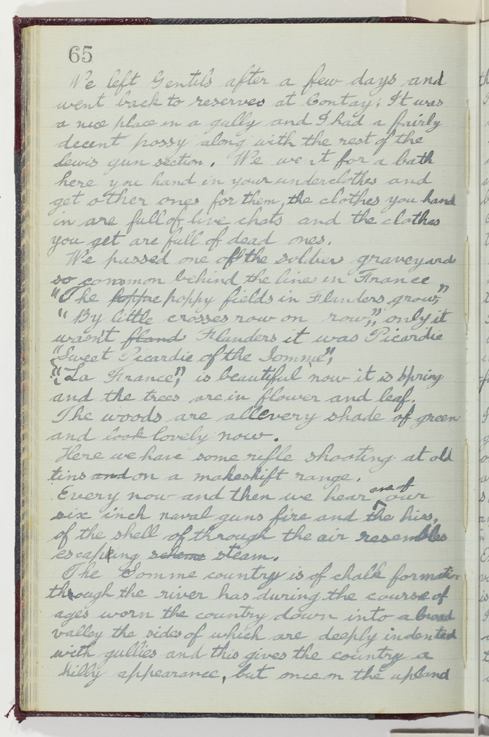 We left Gentils after a few days and went back to reserves at Contay. It was a nice place in a gully and I had a fairly decent posy along with the rest of the Lewis gun section. We went for a bath here you hand in your underclothes and get other ones for them, the clothes you hand in are full of live chats and the clothes you get are full of dead ones.