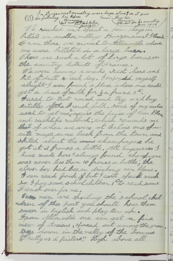 We were having a weeks rest here and bit of drill each day. I enjoyed myself alright I found a place where one could get a dixie of milk for ½ franc 5d. I used to trot round and try and buy eatables off the French folk, some of my mates used to get me to inquire the price of vin Blanc and suchlike rubbish; which reminds me of when we were at Calais and one of our cute mugs came back from the town and skited about the champagne he got at 2 francs a bottle. All enquiries I have made here I always found champagne was never less than 10 francs a bottle; the clever boy had been drinking vin blanc. I can read French, but I can't speak much so I pay some school children 1d to read some French over for me.