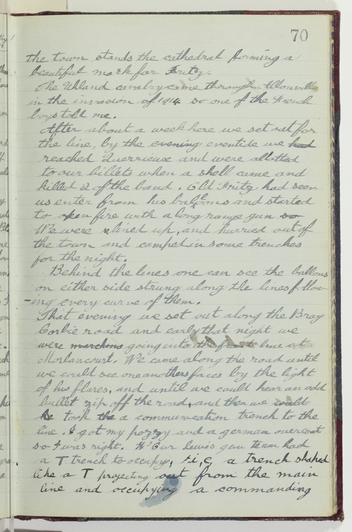 After about a week here we set out for the line, by the eventide we reached Querrieux and were alotted to our billets when a shell came and killed 2 of the band. Old Fritz had seen us enter from his balloons and started to open fire with a long range gun. We were lined up, and hurried out of the town and camped in some trenches for the night.