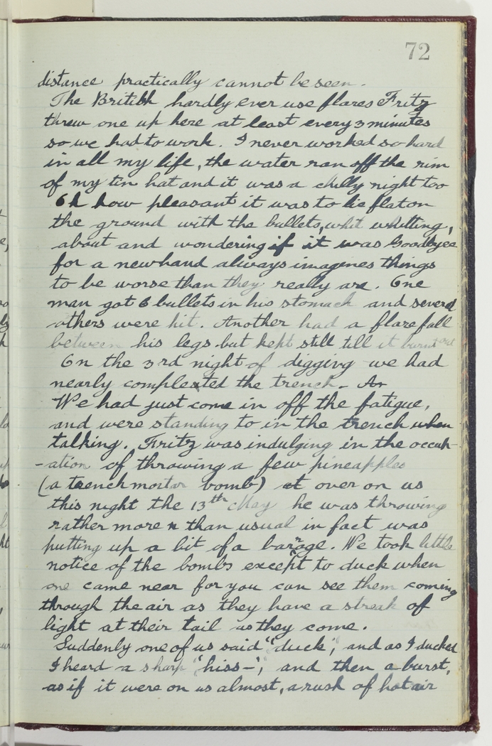 On the third night of digging we had nearly completed the trench. We had just come in off the fatigue, and were standing to in the trench talking. Fritz was indulging in the occupation of throwing a few pineapples (a trench mortar bomb) over on us this night the 13th of May he was throwing rather more than usual in fact - was putting up a bit of a barrage. We took little notice of the bombs except to duck when one came near for you can see them coming through the air as they have a streak of light at their tail as they come.