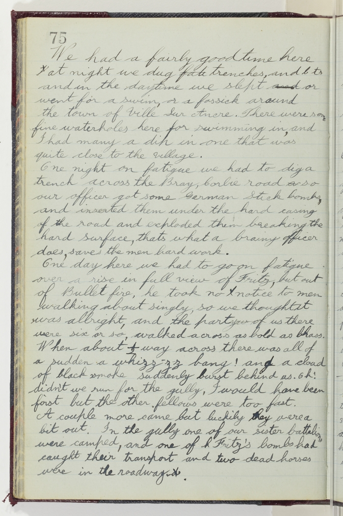 One night on fatigue we had to dig a trench across the Bray, Corbie road so our officer got some German Stick bombs, and inserted them under the hard casing of the road and exploded them breaking the hard surface, thats what a brainy officer does, saves the men hard work.