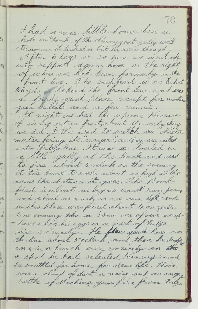At night we had the supreme pleasure of wiring out in front, about the only thing we did. We used to watch our Newton mortar firing its, "rumyars", as they are called onto fritz's line. It was located in a little gully at the back and used to fire about 4 oclock in the evening the bomb travels about as high in the air as the distance it goes. The Bomb fired is about as big as small rum jar, and about as much as one can lift and in this place was fired about 400 yards.