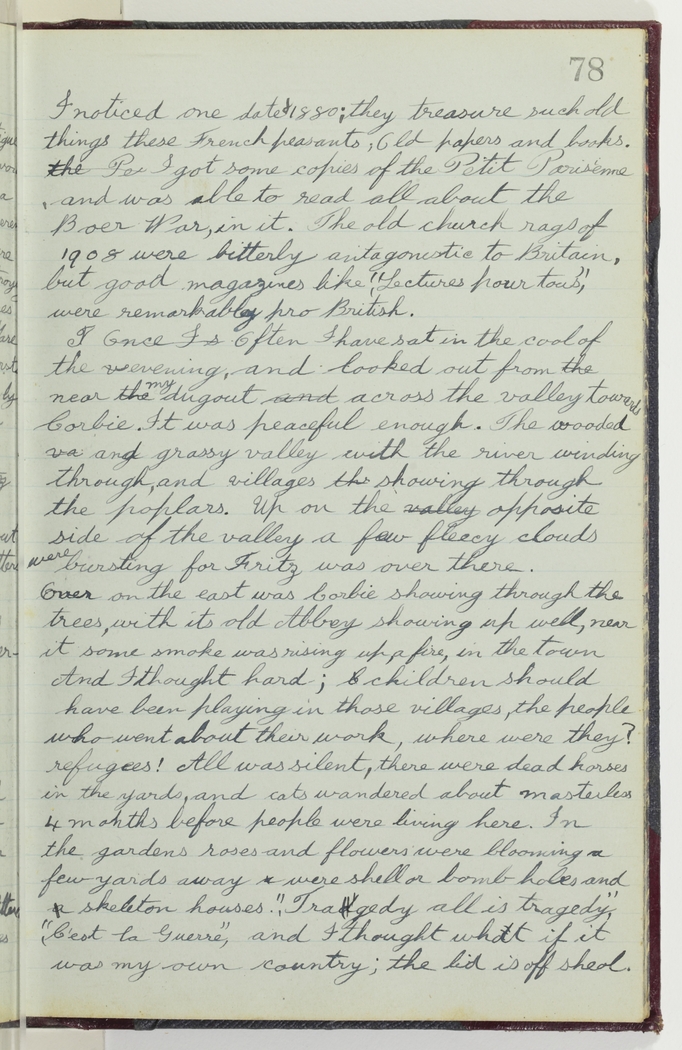 Over on the east was Corbie showing through the trees, with its old Abbey showing up well, near it some smoke was rising up, a fire, in the town. And I thought hard; children should have been playing in those villages, the people who went about their work, where were they? refugees! All was silent, there were dead horses in the yards, and cats wandered about masterless 4 months before people were living here. In the gardens roses and flowers were blooming a few yards away were shell or bomb holes and skeleton houses.