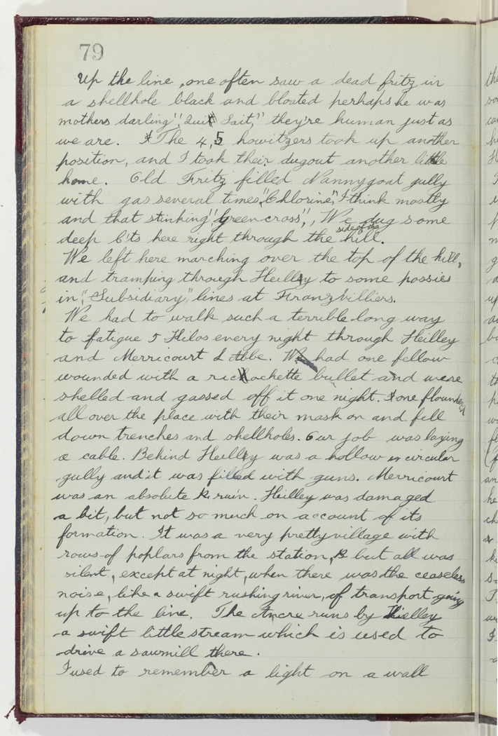 We left here marching over the top of the hill, and tramping through Heilly to some possies in "Subsidiary" lines at Franzvilliers. We had to walk such a terrible long way to fatigue Kilos every night through Heilley and Merricourt L Abbe. We had one fellow wounded with a ricochette bullet and were shelled and gassed off it one night. One floundered all over the place with their mask on and fell down trenches and shellholes. Our job was laying a cable. Behind Heilly was a hollow circular gully and it was filled with guns. Merricourt was an absolute ruin. Heilley was damaged a bit, but not so much on account of its formation. It was a very pretty village with rows of poplars from the station, but all was silent, except at night, when there was the ceaseless noise, like a swift rushing river of transport going up to the line. The Ancre runs by the Tilley, a swift little stream which is used to drive a sawmill there.