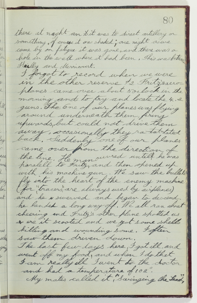 I forgot to record when we were in the other reserve & 2 Fritz's aeroplanes came over about 5 oclock in the morning to try and locate the 4.2 guns. One of our planes was flying around underneath them, firing upwards, but could not drive them away, occasionally they rat-tat-tated back. Suddenly one of our planes came over from the direction of the line. He manouvred until he was paralell to Fritz, and then opened up with his machine gun. We saw the bullets fly into the heart of the enemy machine (for "tracers" are always used by airplanes) and he swerved and began to descend. he landed a long way off. We all ran about cheering and Fritz's other plane spotted us ere it scooted and we got some shells killing and wounding some. I often saw them driven down.