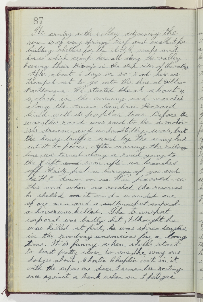 The country in the valley adjoining the river is of very springy turf and excellent for building shelters for the A, S, C camps and horses which camp here all along the valley, haveing their Bivvy's in the steep sides of the valley. After about 6 days or so here we tramped out to go into the line at Villers Brettonneux. We started at about 4 o,clock in the evening and marched along the Amiens Cambrai road lined with its poplar trees. Before the war, this road was said to be a motorists dream , and undoubtedley was, but the heavy traffic used by the army had cut it to pieces. After crossing the railway line, we turned along a road going to the left soon after we branched off Fritz put a barrage of gas and H,C down on us. We passed this and when we reached the reserves he shelled it and wounded one of our men and a transport corporal a horse was killed. The transport corporal was badly hit, I thought he was killed at first, he was spreadeagled in the roadway unconscious for a long time. It is funny when shells start to burst pretty close to one, the way one dodges about. Charlie Chaplin isn't in it with the capers one does. I remember resting once against a bank when on fatigue