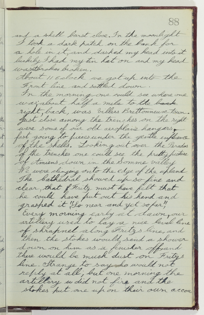 About 11 oclock we got up into the Front line and settled down. In the morning one could see where one was; about half a mile to the right, back, was Villers Brettonneux town. Just close among the trenches on the right were some of our old aeroplane hangars, fast going to pieces under the gentle influence of the shells. Looking out over the Parados of the trenches one could see the pretty picture of Amiens down in the Somme valley. We were clinging onto the edge of the upland. The Cathedral showed up so fine and clear, that Fritz must have felt that he could have put out his hand and grasped it "so near and yet so far".