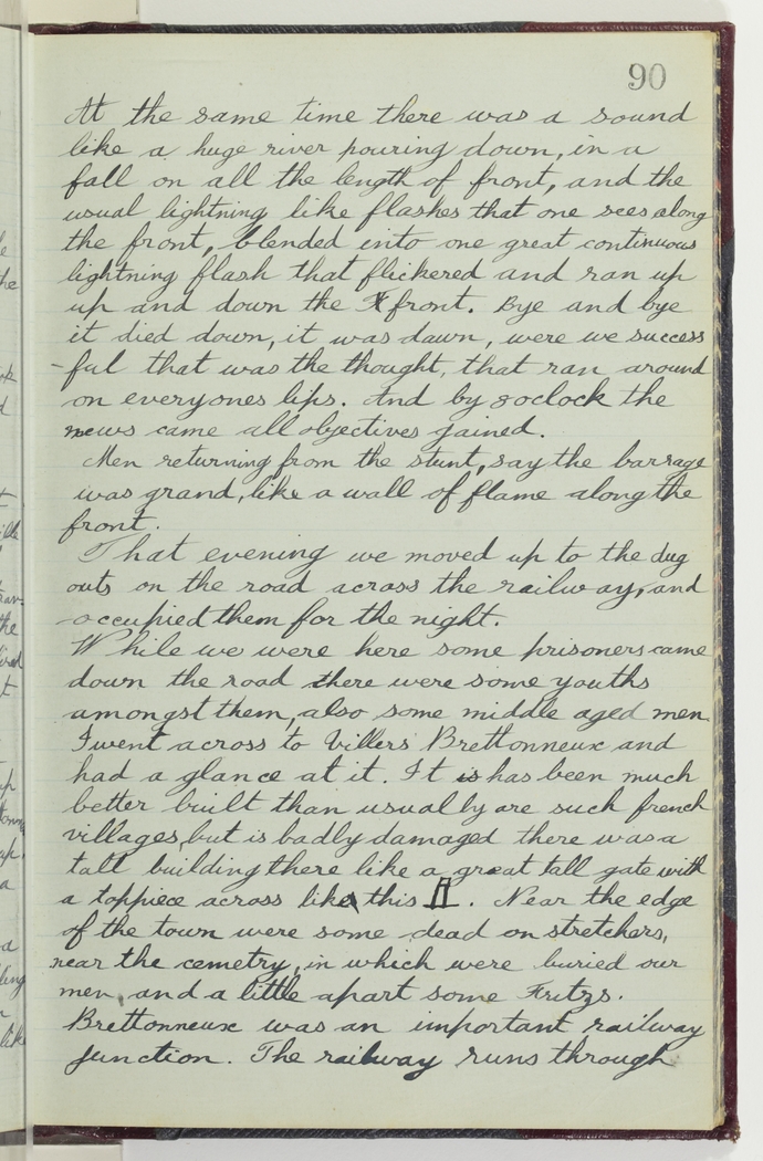 At the same time there was a sound like a huge river pouring down, in a fall on all the length of front, and the usual lightning like flashes that one sees along the front, blended into one great continous lightning flash that flickered and ran up and down the front. Bye and bye it died down, it was dawn, were we successful, that was the thought, that ran around on everyones lips. And by 8 oclock the news came all objectives gained.