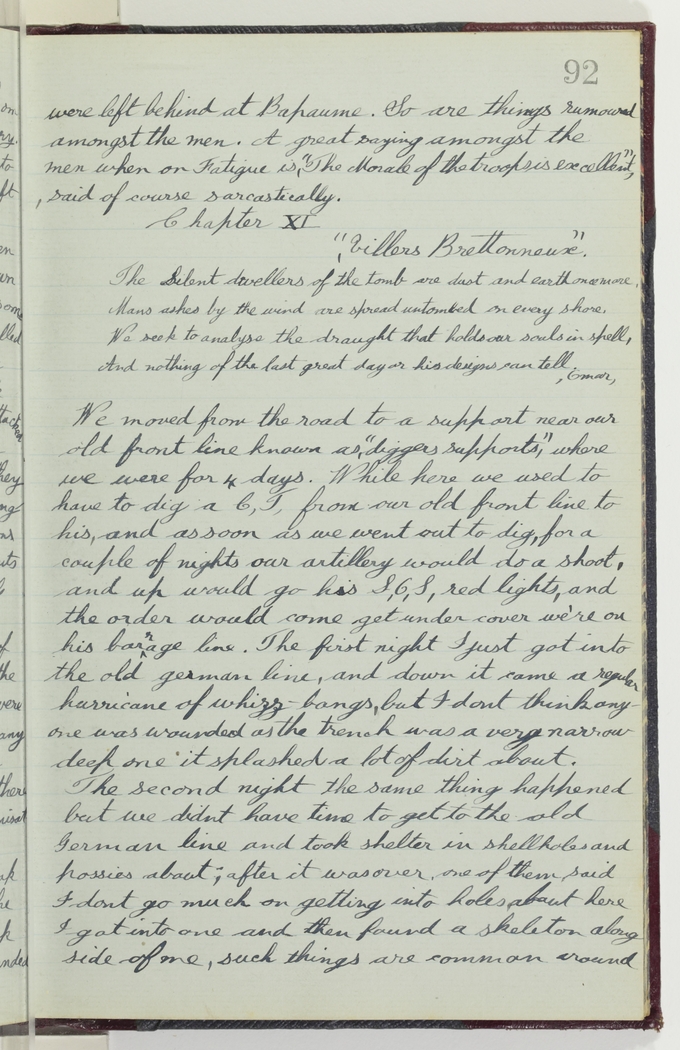 We moved from the road to a support near our old front line known as, "diggers supports", where we were for 4 days. While here we used to have to dig C, J, from our old front line to his, and as soon as we went out to dig, for a couple of nights our artillery would do a shoot, and up would go his S,O,S, red lights, and the order would come get undercover we're on his barrage line. The first night I just got into the old german line, and down it came a regular hurrican of whizz-bangs, but I don't think anyone was wounded as the trench was a very narrow, deep one it splashed a lot of dirt about. The second night the same thing happened but we didn't have time to get to the old German line and took shelter in shellholes and possies about; after it was over, one of them said I don't go much on getting into holes about here I got into one and then found a skeleton along side of me, such things are common around