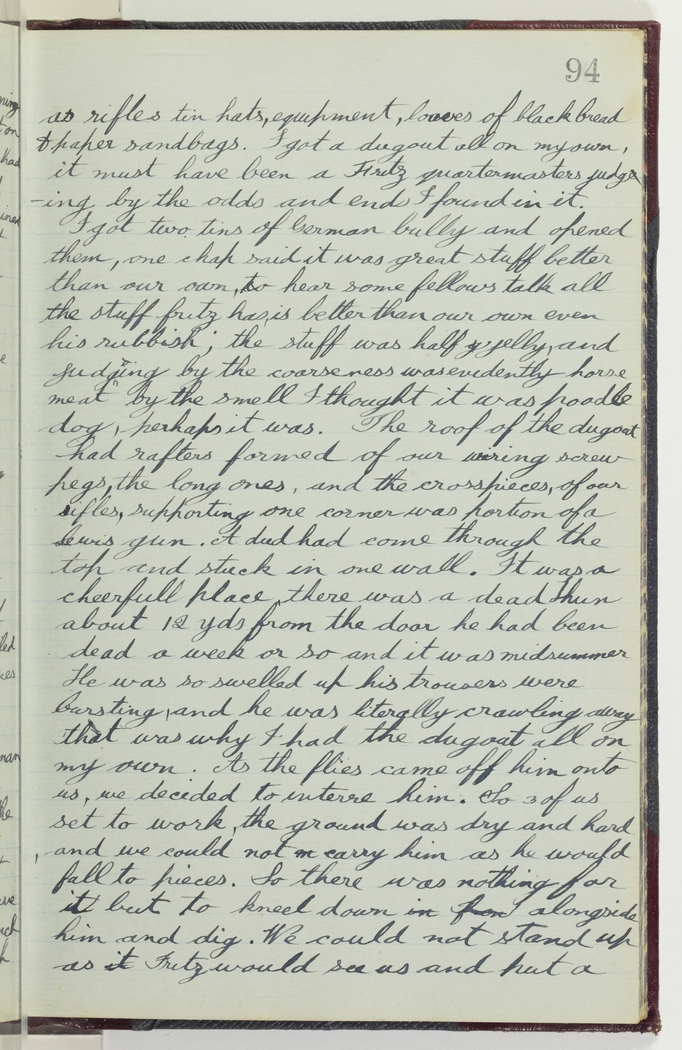 I got two tins of German bully and opened them, one chap said it was great stuff better than our own, to hear some fellows talk all the stuff Fritz has, is better than our own, even his rubbish; the stuff was half jelly, and judging by the coarseness was evidently horse meat by the smell I thought it was poodle dog, perhaps it was. The roof of the dugout had rafters formed of our wiring screw pegs, the long ones, and the crosspieces, of our rifles, supporting one corner was portion of a Lewis gun. A dud had come through the top and stuck in one wall. It was a cheerfull place, there was a dead Hun about 12 yards from the door he had been dead a week or so and it was midsummer. He was so swelled up his trousers were bursting, and he was literally crawling away that was why I had the dugout all on my own. As the flies came off him onto us, we decided to interre him. So 3 of us set to work, the ground was dry and hard and we could not carry him as he would fall to pieces. So there was nothing to do for it but to kneel down along side him and dig. We could not stand up as Fritz would see us and put a