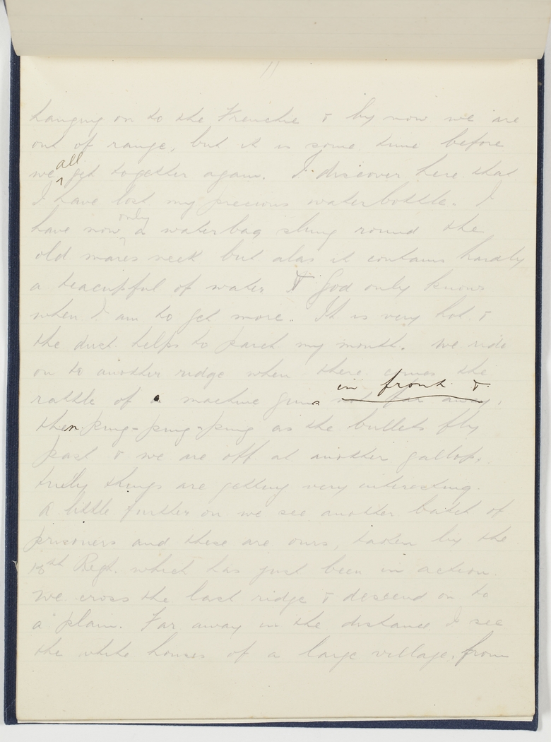 hanging on to the Frenchie & by now we are out of range, but it is some time before we ^all get together again. I discover here that I have lost my precious water bottle. I have now ^only a water bag slung round the old mares neck but alas it contains hardly a teacupful of water. I God only knows when I am to get more. It is very hot & the dust helps to parch my mouth. We ride on to another ridge when there comes the rattle of machine guns not far away in front & then ping-ping-ping as the bullets fly past & we are off at another gallop, truly things are getting very interesting. A little further on we see another batch of prisoners and these are ours, taken by the 15th Regt which has just been in action. We cross the last ridge & descend on to a plain. Far away in the distance I see the white homes of a large village, from